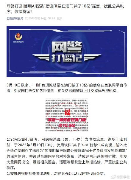 据“公安部网安局”微信公号:3月10日以来,一则“有顶流明星在澳门输了10亿”的信息在互联网平台传播,引发网民热议和各种猜测,相关话题频繁登上社交媒体热搜热榜。造谣顶流明星输10亿的男子被拘留 公安网安部门查明,网民徐某强(男,36岁)为博取流量、谋取非法利益,于2025年3月10日10时,使用软件“某书”中AI智慧生成功能,输入社会热点词制作了标题为“顶流明星被曝境外豪赌输光十亿身价引发舆论海啸”的谣言信息,并通过互联网平台对外发布,造成谣言迅速传播扩散,引发大量网民议论,诱发相关谣言、话题等频繁登上热搜热榜,严重扰乱公共秩序。 公安机关根据相关法律法规,对徐某强处以行政拘留8日处罚。