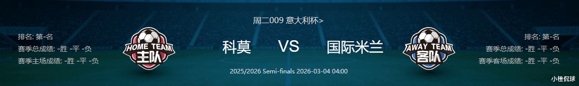 看法:两队历史交锋呈现国际米兰绝对碾压的格局,近11次对阵科莫9胜2平保持不败,近期6次交手更是全部取胜且5场零封,本赛季首轮主场4-0大胜科莫,进一步巩固了心理优势,且科莫近5次对阵国米均未能取得进球,进攻端面对蓝黑军团时面临巨大考验。不过科莫近期状态上佳,主场有一定优势,面对强队时表现不怯场,本场比赛科莫有望利用主场和士气争取进球,不过国际米兰也不是等闲之辈,此役可关注科莫主场小败或者不败较为稳妥。