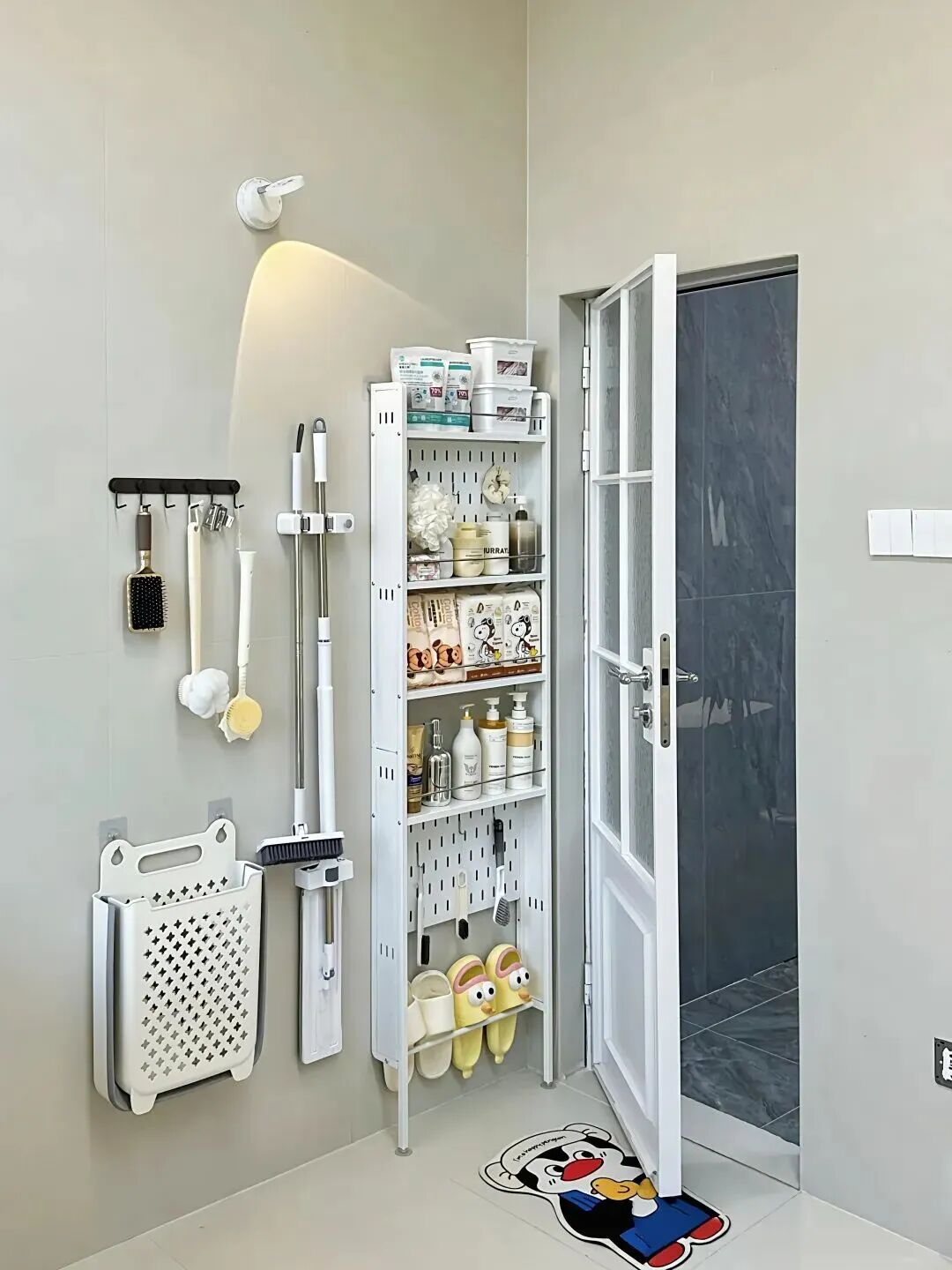 拖把水桶可以挂在门后,洗脸盆可以放在悬空柜底下。