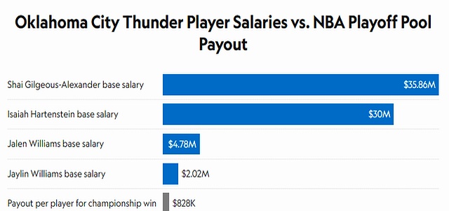 雷霆队,联盟最年轻的球队,工资也低,要是真夺冠了,能拿1240万美元,平均每人82.8万美元。