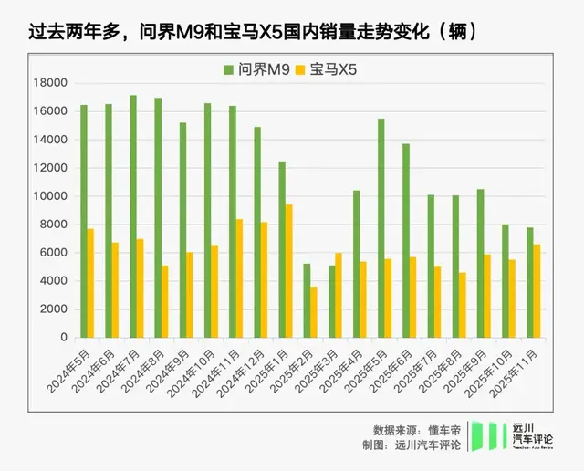 在豪车中,问界M9是典型的代表,在其之前国内规模以上的豪车市场基本被BBA垄断,中国品牌在50万以上的豪华车市场却没有样本,不过至今日问界M9全系累计销量已经达到26万辆。综合远川等平台统计的数据,该车型月销基本过万,假设对比宝马X5L,平均月销在5000辆左右。