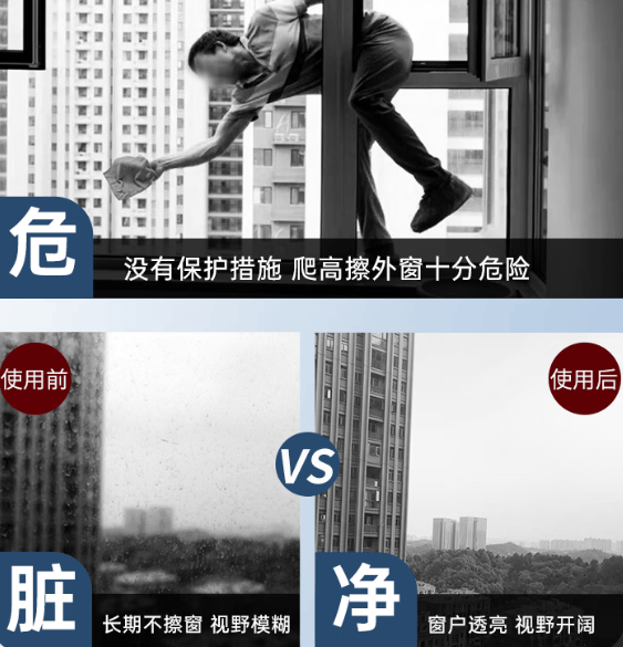 你是否也曾为擦窗耗费半天时光,却仍不尽如人意?准备水桶、抹布、玻璃水等一堆工具,反复擦拭、换水,弯腰、抬手的动作不断重复,一套流程下来腰酸背痛,原本干净的地面还会被溅湿的水渍弄脏。尤其是大面积玻璃或异形窗户,清洁难度翻倍,耗时又耗力。在快节奏的现代生活中,我们早已没有多余时间浪费在低效的家务上。