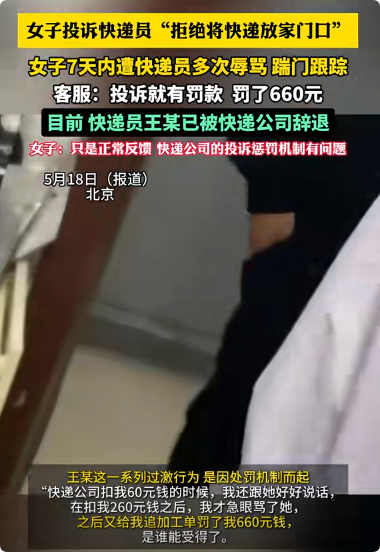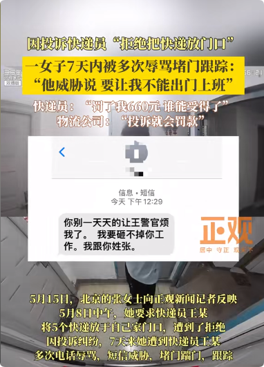 事情发生在5月8号的北京。张女士因为要加班,她便要求快递员王某将包裹放在她的家门口。可快递员却以担心快递丢失为由拒绝了。他强调:“如果丢了,我得赔!”当张女士遭到拒绝后,她选择了投诉。