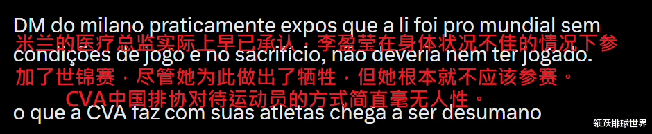 根据爆料,米兰女排的医疗总监早已承认,李盈莹在身体状况不佳的情况下参加了世锦赛,尽管她为此做出了牺牲,但是她根本不应该参赛,CVA中国排协对待运动员的方式简直毫无人性。