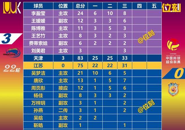 2024/25中国女排超级联赛A级四强排位赛第二轮结束,天津女排以3-0横扫江苏女排,但是比赛过程非常艰难,目前天津以4胜0负排名E组第一,江苏则是3胜1负排名第二。首局天津8-5领先,中段取得7分优势,末段领先5分,最终以25-22艰难拿下。本局天津扣球得分10-17,扣球成功率32%比40%,扣球失误1-6,被拦回0-3,一传到位率29%比4%,拦网3-0,发球4-2,失误得分8-3。本局李盈莹砍下6分,王媛媛3分,陈博雅3分,王艺竹3分。吴梦洁狂砍10分,杨佳3分,吴晗2分。