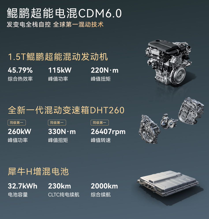 这套系统搭载了斩获“中国心”十佳发动机称号的1.5T鲲鹏超能混动发动机,具备45.79%的行业顶尖热效率。配合全新一代DHT260混动变速箱,实现了惊人的性能数据: