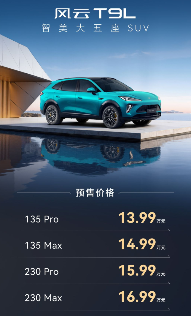 风云T9L 预售价格区间:135 Pro: 13.99万元135 Max: 14.99万元230 Pro: 15.99万元230 Max: 16.99万元