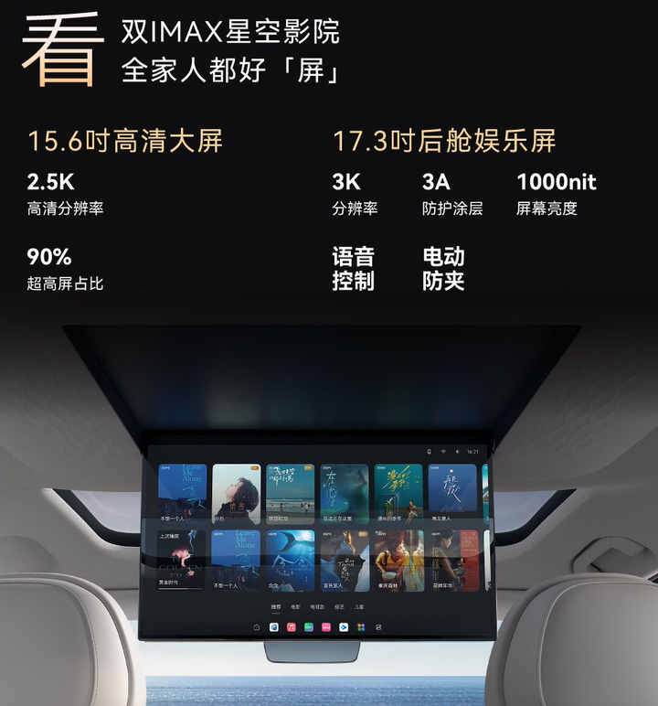 娱乐体验更是拉满,车内配备了双IMAX星空影院。前排拥有15.6吋2.5K高清大屏(90%超高屏占比),后排则配备了同级唯一的17.3吋3K高清低蓝光吸顶屏,支持语音和电动控制,并具备防夹功能。搭配同级唯一23扬伯牙之音音响,为全家人打造殿堂级的视听盛宴。