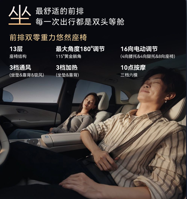 车辆配备了同级唯一前排双零重力座椅,采用13层座椅结构,主副驾均支持16向电动调节、3档通风/加热/按摩,以及115°黄金躺角。二排同样拥有同级最大的1037mm腿部空间,搭配同级唯一6铰链小桌板,让每一位家人都能享受头等舱级别的舒享待遇。此外,常规573L的后备箱容积在二排放倒后可拓展至1597L,配合前后排双大床模式,完美适配全场景家庭出行。