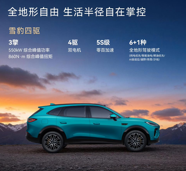 为了应对复杂路况,风云T9L配备了雪豹智能四驱系统和双电机布局,提供6+1种全地形驾驶模式(纯电优先/智能油电/燃油优先/AI自适应/越野/雨雪/沙地)。无论是城市通勤还是山路穿越,都能从容应对。