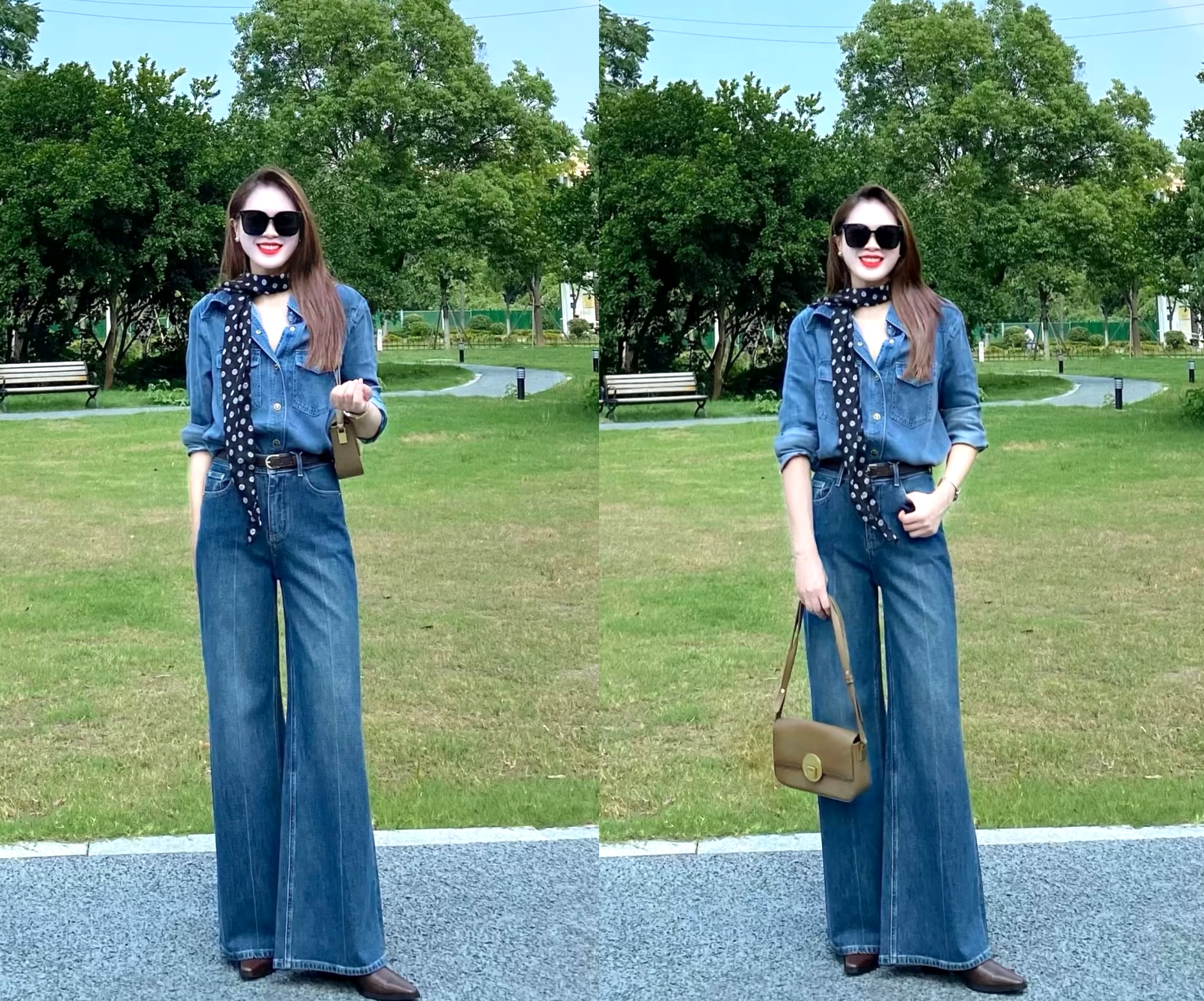 而一个腋下包和一条丝巾,能为造型增加优雅气质和精致感,让牛仔衬衫和牛仔裤造型,变得不再那么粗犷和随性。