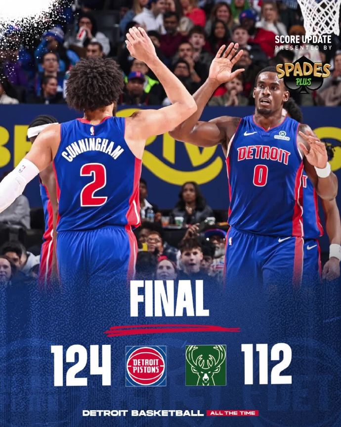 在上一场力克开拓者之后,活塞今天又在主场124-112大胜没有字母哥的雄鹿,取得两连胜,战绩来到19胜5负,稳居东部第一。而雄鹿遭遇两连败,战绩仅10胜15负,依旧无缘东部前十,仅排在东部第十一。值得一提的是,活塞本赛季已经双杀雄鹿,这也是他们自2018年以来,首次在单赛季多次击败雄鹿。