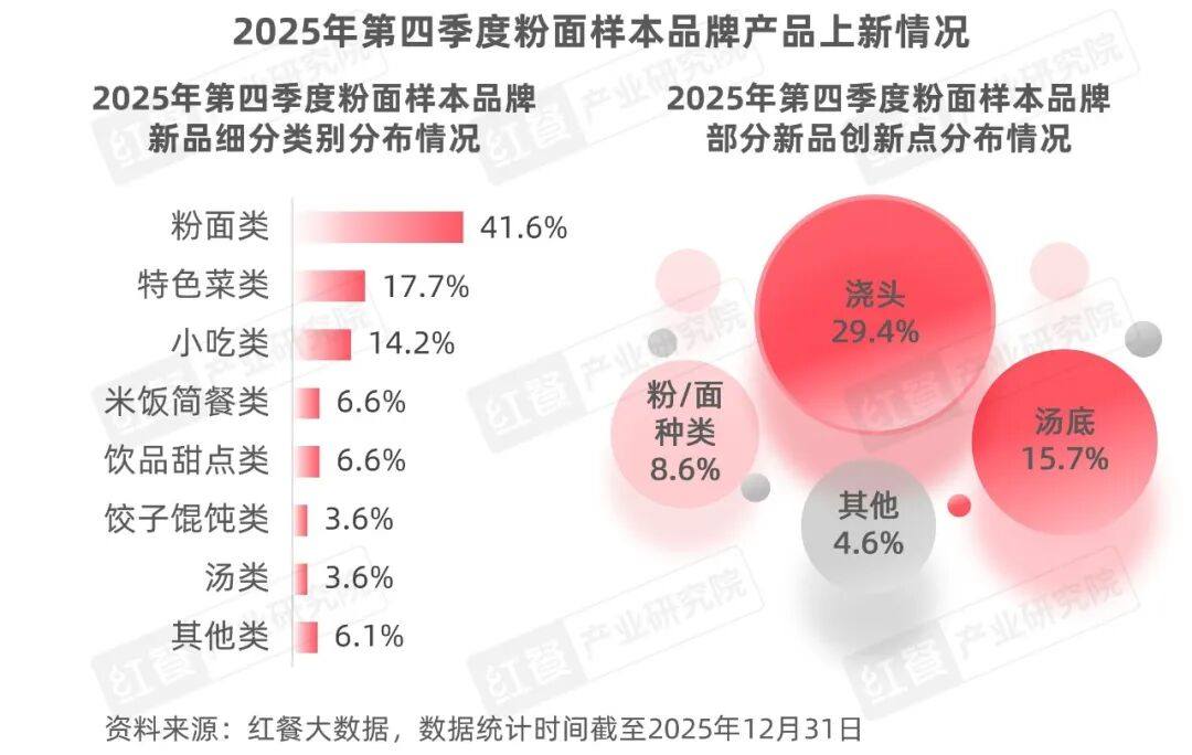 2.粉面:粉面新品品质升级趋势显著,配料汤底成创新核心2025年第四季度,红餐产业研究院监测的粉面样本品牌中,有34个品牌共推出了197款新品。从新品的细分类别来看,新品涵盖的类别有粉面类、特色菜类、小吃类、饮品甜点类、米饭简餐类等8种类别。