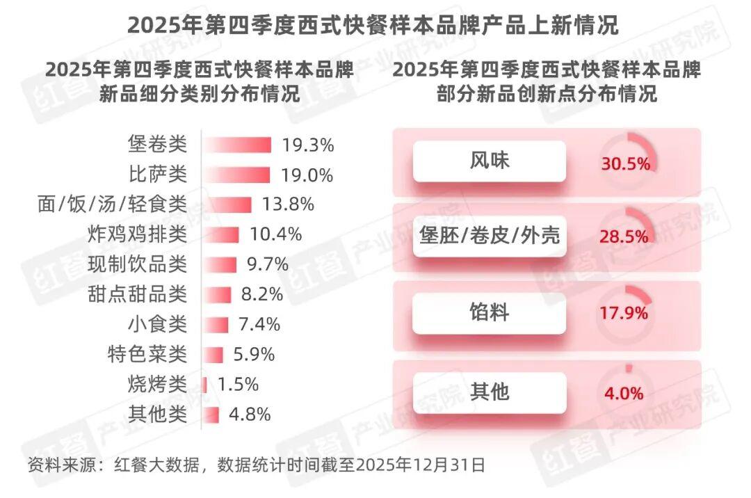 1.西式快餐:品牌多元布局新品,风味融合与胚底升级并行2025年第四季度,红餐产业研究院监测的西式快餐样本品牌中,有36个品牌共推出了269款新品。从新品的细分类别来看,第四季度新品涵盖的类别有堡卷类、比萨类、面/饭/汤/轻食类、炸鸡鸡排类、现制饮品类等10种类别。