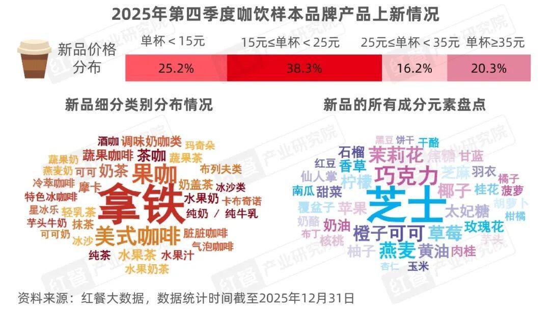 4.咖饮:拿铁占据新品主流,草莓和燕麦成为咖饮品牌青睐的元素2025年第四季度,红餐产业研究院监测到有32个咖饮样本品牌共推出了572款新品,其中咖啡类新品210款,茶饮类新品69款,零售类产品226款,烘焙类和甜品类新品总计51款。