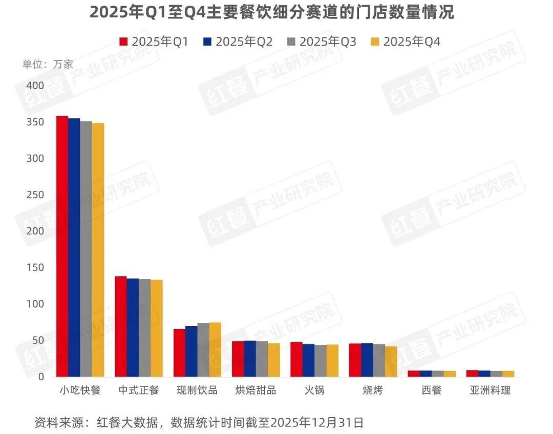 2.门店数概况:第四季度主要细分赛道的门店数量小幅回落,现制饮品与火锅赛道表现突出门店数方面,各细分赛道表现各不相同。红餐大数据显示,从主要细分赛道的门店数量来看,截至2025年第四季度,小吃快餐、中式正餐、现制饮品仍位列细分赛道门店数量前三,紧随其后的依次为烘焙甜品、火锅、烧烤、西餐和亚洲料理。