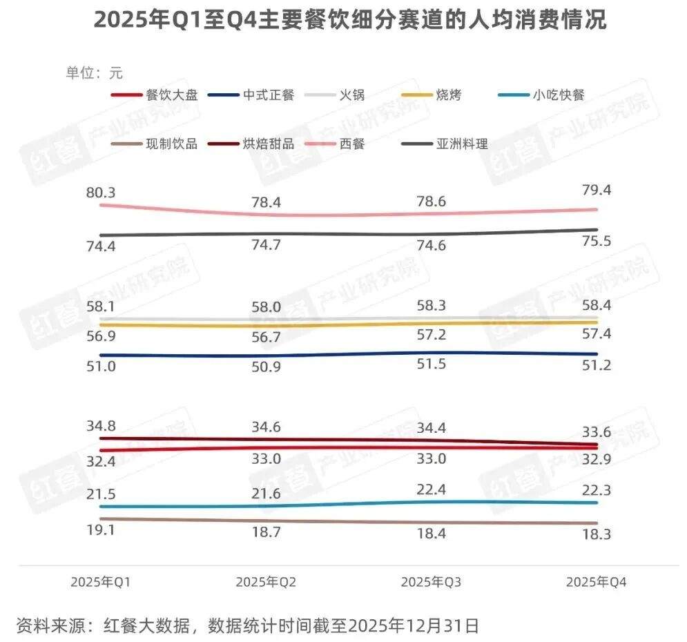 从主要餐饮细分赛道来看,2025年第四季度相较第三季度,西餐和亚洲料理赛道的人均消费小幅上升,其中西餐赛道从78.6元升至79.4元,亚洲料理赛道从74.6元升至75.5元。而烘焙甜品赛道的人均消费则出现微降趋势,从34.4元降至33.6元。其他餐饮细分赛道的人均消费则整体变化不大。
