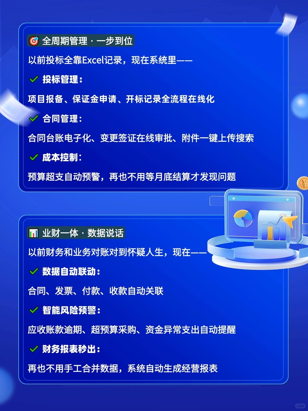 做工程的都懂那种痛: 📁 合同堆成山,要找却翻不到 📊 成本控不住,月底一看又超了 🏗️ 进度跟不紧,甲方天天打电话催 💰 对账对到晕,数据永远对不上 直到我们用了这套普斯泰工程管理系统,才发现原来管理可以这么简单! - 🎯 四大核心价值,解决真问题: 1️⃣ 全周期一步到位 ✔️ 投标:项目报备到开标,手机就能操作 ✔️ 合同:电子台账+在线审批,文件一秒查到 ✔️ 成本:超支自动提醒,不用等月底"惊吓" - 2️⃣ 业财一体联动 ✔️ 合同与发票自动关联,对账不再愁 ✔️ 风险智能提醒:逾期账款、异常支出都会预警 ✔️ 财务报表自动生成,准确率提升90% - 3️⃣ 项目实时可控 ✔️ 甘特图看板:进度好不好一眼知道 ✔️ 利润随时看:今天挣多少心里有数 ✔️ 经营数据看板:决策靠数据不靠猜 - 4️⃣ 现场精细管理 ✔️ 质量安全:巡检整改全程记录 ✔️ 材料管理:从采购到领用一清二楚 ✔️ 施工日志:云端存储随时查 - 💡 半年真实改变: ▫️ 老板说:"早知道用,去年多接两个项目" ▫️ 项目经理说:"现在管理,心里有底了" ▫️ 财务说:"对账,再也不用加班了" ▫️ 现场说:"效率,真得提高不少" - 这套系统,不光是工具,更是让工程管理变简单的方法 。如果你也在找提升管理效率的办法,这套系统真的值得试试~