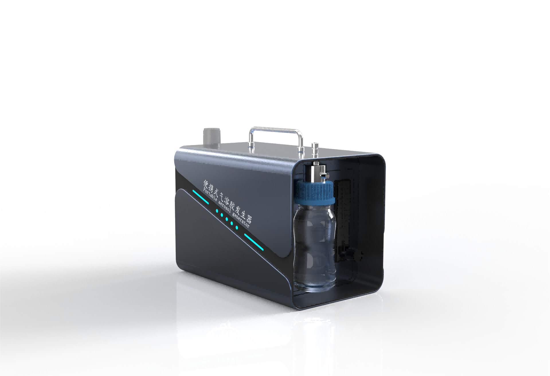 气溶胶发生器为液体型气溶胶发生器,可对溶液持续稳定的产生气溶胶气雾,气溶胶的浓度可调。气溶胶发生器的样品瓶采用高硼硅玻璃材质,内置特殊设计的喷嘴。气溶胶发生器内置微型空压机,空气进入样品瓶的喷嘴处,通过高速气流和液体之间形成剪切力产生气溶胶气雾。通过惯性碰撞使大粒径的颗粒返回容器,输出小粒径的气溶胶,气溶胶的粒径分布主要在2um以内。气溶胶发生器的样品瓶整个可以高温高压消毒,可反复使用,适合药物溶液气溶胶产生。气溶胶发生器内置微型空压机,接通电源即可工作,小巧方便,也非常适合过滤器及洁净间现场检测。