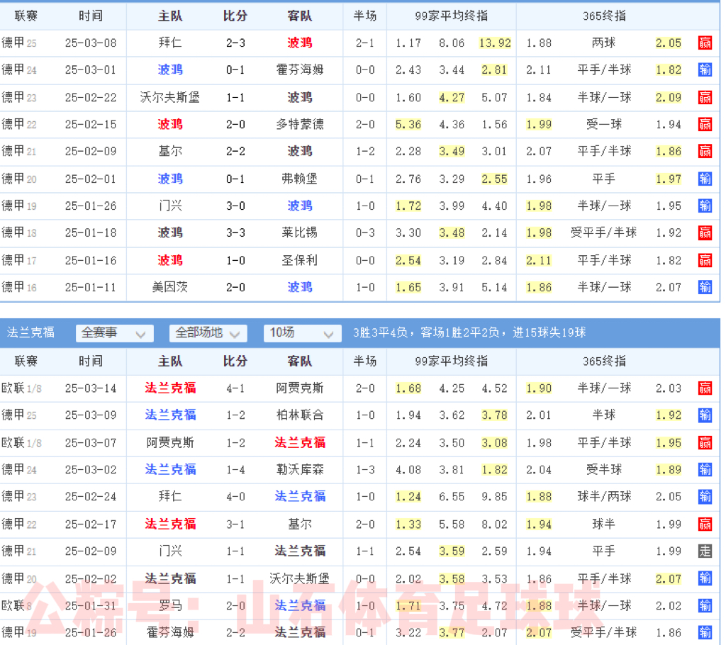 二、主客场战绩波鸿:最近12场联赛主场球队拿到3胜3平6负的战绩单,主场取胜率为三成。法兰克福:过去12场联赛客场球队上交5胜3平4负的战绩单,客胜率41.7%。