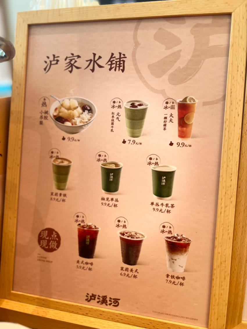 专门开辟的“泸家水铺”茶咖售卖区,则为消费者提供9款现制茶咖饮品。产品涵盖美式咖啡、茉莉美式、茉莉拿铁等风味咖啡,以及元气红枣桂圆牛乳、桃胶小吊梨、大大一颗柠檬茶、清爽果茶、柚见单丛、乌龙茶底果茶、单丛牛乳茶等中式饮品。茶咖整体的售价在5.9-9.9元之间,同样主打高性价比。