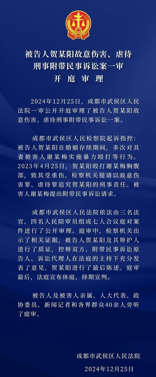 2023年4月25日,贺某阳对妻子小谢实施了史无前例的暴力殴打,导致受害人多处器官严重受损。根据武侯区检察院的起诉书显示,贺某阳在两年婚姻期间,对妻子实施了16次家庭暴力,造成包括重伤二级在内的多处伤情。