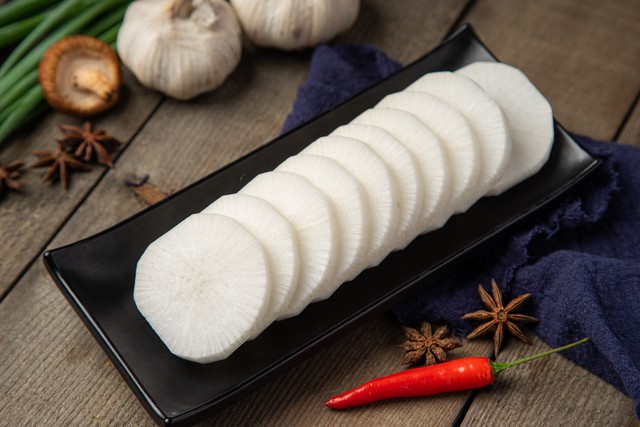 萝卜切薄片,用盐腌制1小时后挤干水分