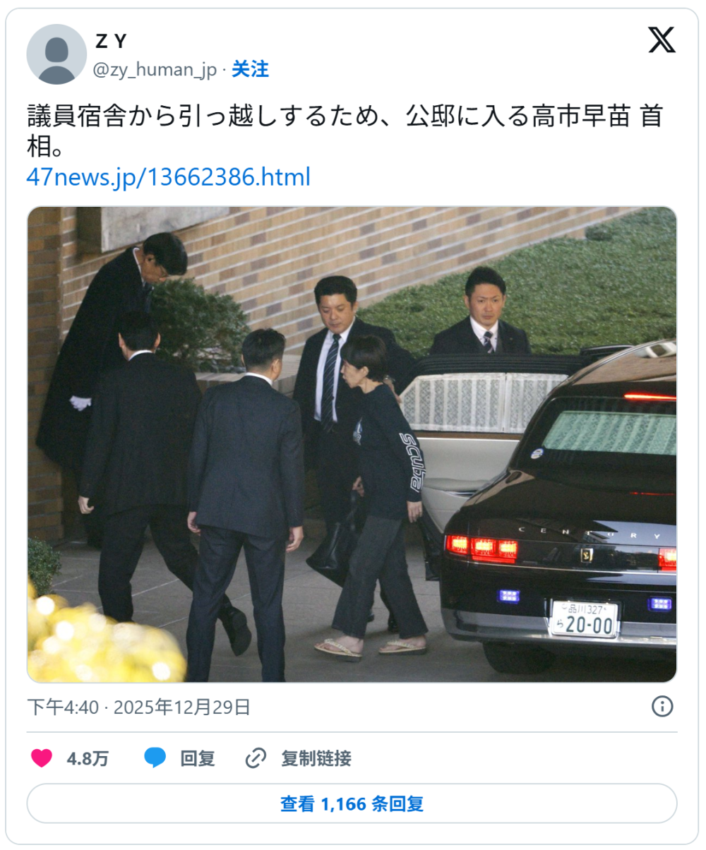 据日本媒体报道,高市因公务繁忙,选择在年假期间搬家。昨日下午起,搬家公司开始陆续将超过50箱行李送入公邸。深夜时分,她从位于东京都赤坂的众议员宿舍乘车前往首相公邸,身穿黑色运动服,脚穿日式夹脚拖,整体装扮显得十分轻松。