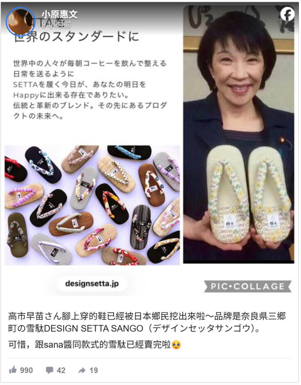此外,脸书粉专「小原惠文」也指出,高市所穿的雪駄品牌为奈良县三乡町的DESIGN SETTA SANGO(デザインセッタサンゴウ),并引发了网友的广泛关注,但同款雪駄目前已经显示售罄。