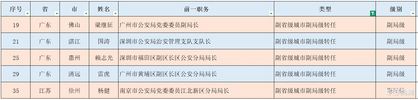 广州市公安局副局长调任佛山,广州黄浦区副区长、分局局长调清远,深圳治安支队支队长调清远、深圳福田副区长、分局局长调惠州,南京市局党委委员、江北分局局长调徐州,从级别上讲没有任何问题。