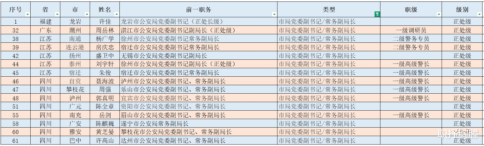 市公安局党委副书记、常务副局长作为市局的二把手,负责市公安局日常事务,应该说距离局长一步之遥但是各地略有区别,比如广东16人当中仅有1人是常务副局长提拔而来,四川20人当中多达8人是这种情况,即便是江苏的11人当中,有5人此前担任市公安局党委副书记/常务副局长。