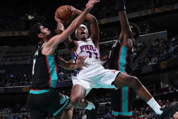 灰熊强侧发动挡拆,费城弱侧大面积回收压缩中路空间,VJ阅读到阿尔达马要出球给弱侧底角后,判断到传球路线,迅速交叉步上前高高跃起抄截传球。