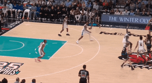 抓早攻超高位置为马克西设置掩护帮其点名到莫兰特,随即趁马克西吸引双人防守迅速Slip滑走。接马克西击地上球后立即突破直杀篮下,假动作点飞JJJ立即起身顶着两人干扰后仰上篮打进。