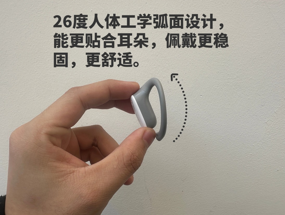 佩戴体验:华为FreeArc佩戴表现稳固但存在不足。单耳 9g 搭配 C 形桥与三角稳固设计,能贴合耳廓,运动时不易晃动。但耳挂体积较大,长时间佩戴后,耳廓处易产生异物压迫感,尤其对小耳型用户不太友好,适合短时间佩戴或运动场景。