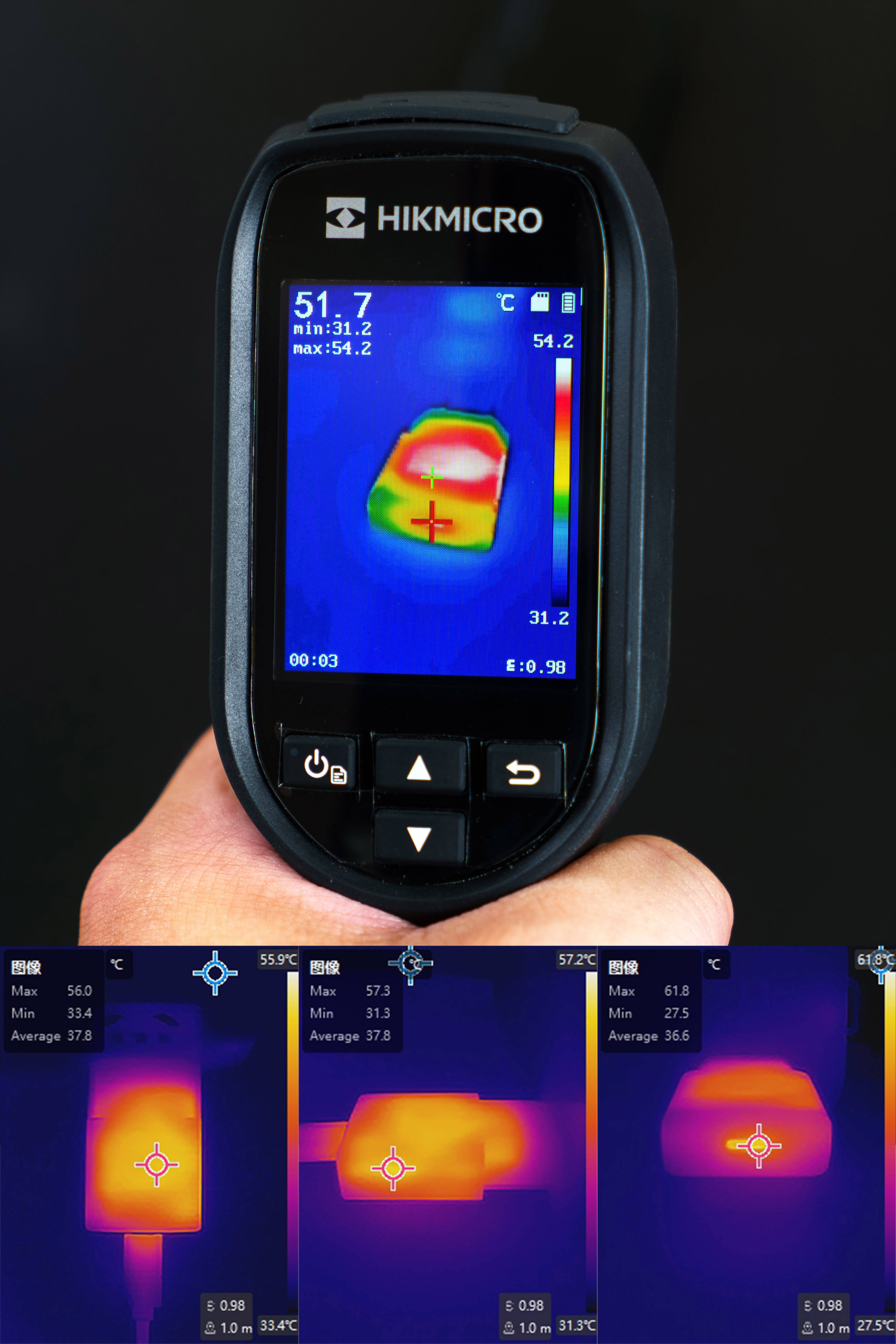 ▼充电器在充电过程中,会以发热的形式产生损耗,所有充电设备、电源都是如此,所以我也进行了温度测试;用这款爱兰博30W纤薄氮化镓充电器给VIVO X100充电15分钟后,用热成像仪拍摄发热情况,可以看到热量主要集中在接口附近,表面温度也比大部分同类充电头要低一些,不过能发热也不是什么坏事,毕竟热量能够及时散出去才是健康的表现;它采用了自主研发的新型变压器系统和独特的变压器结构,在确保产品超小体积的前提下,实现高效充电,产品效率高达91%,与行业知名品牌相比,能量损耗降低了10%-20%,所以别看它小,迸发的能量还是很强的