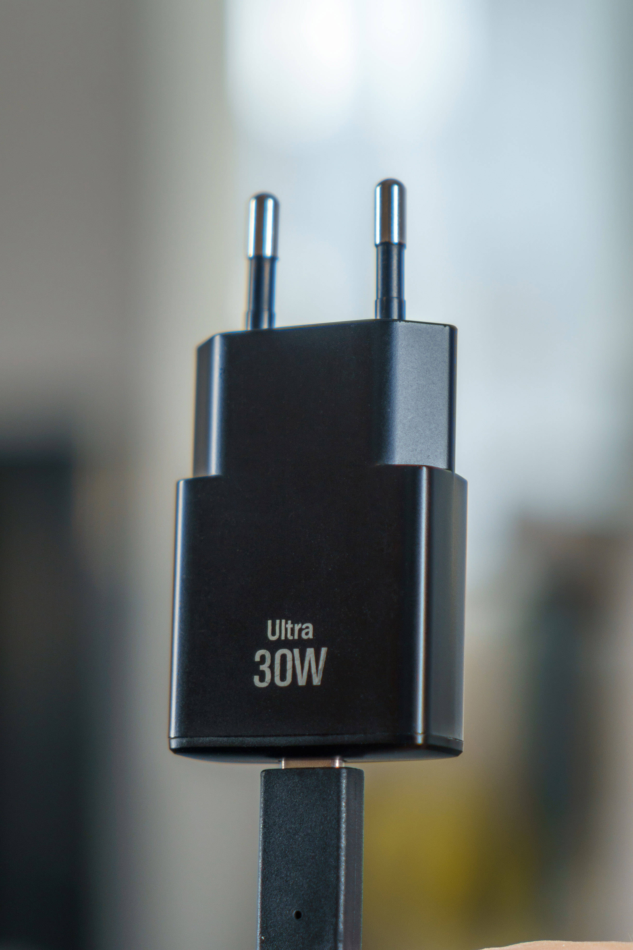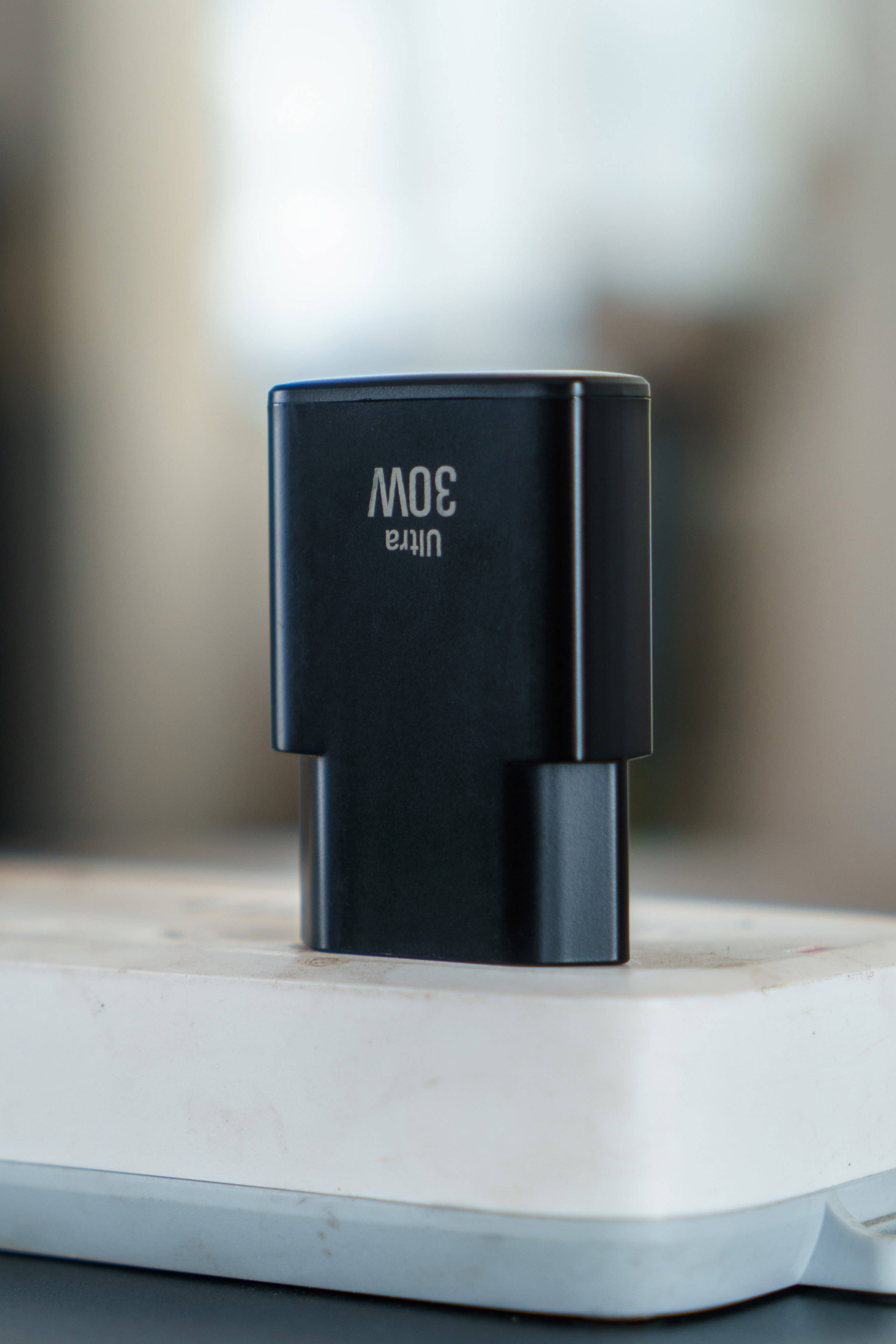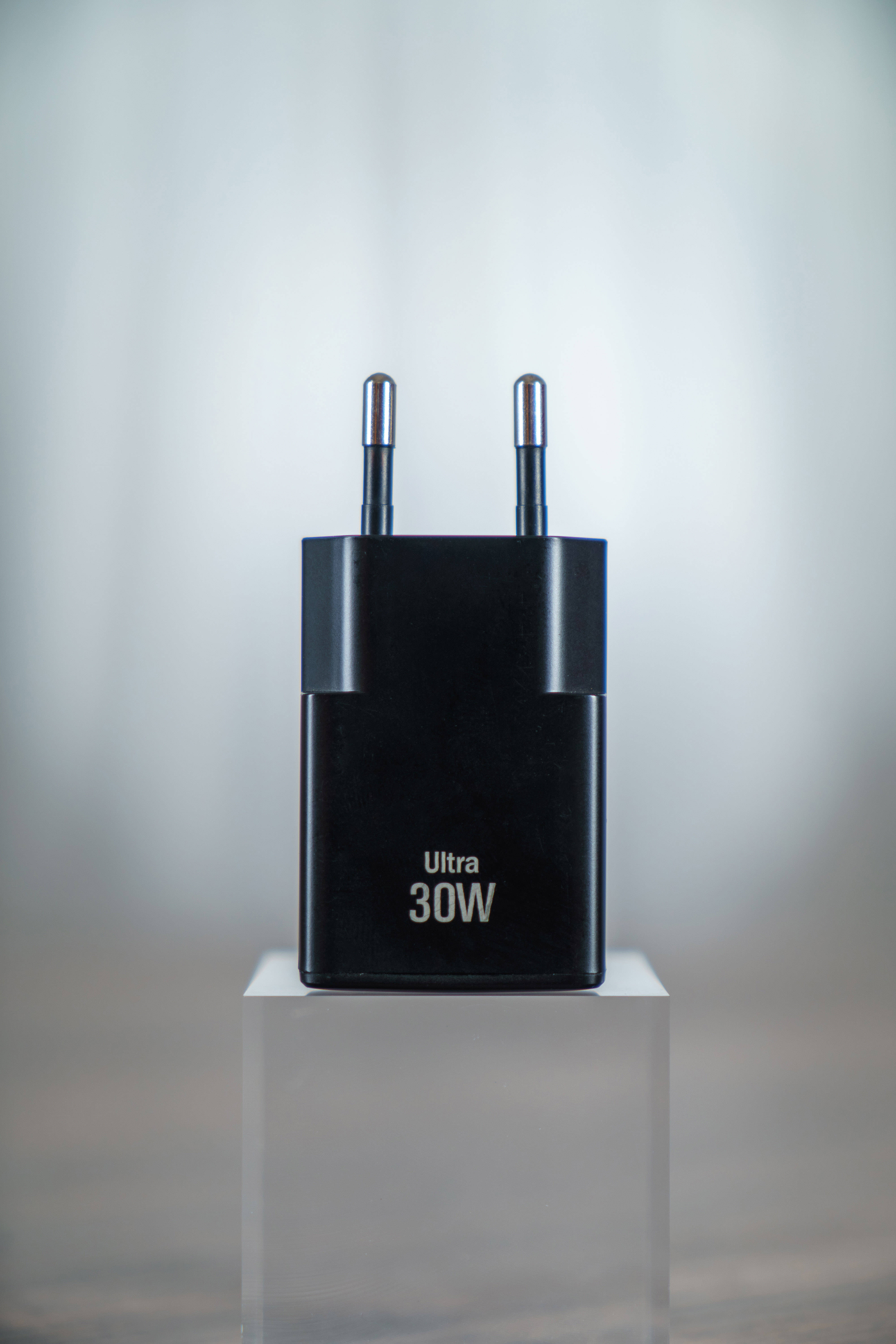 产品外观展示及介绍▼首先看一下产品的正面。通体黑色磨砂的表面处理,磨砂的好处就是耐指纹;最显眼的就是底下那30W和Ultra的文字标识,猜测它应该还有别的版本,比如Pro版这种;然后最上面就是欧规标志性的圆柱形插头了,乍一看它的造型大家可能并不会感觉有什么特别的,可能会觉得这不就是一个标准欧规风格的充电头嘛,不要急,等下换个角度看一下就知道了