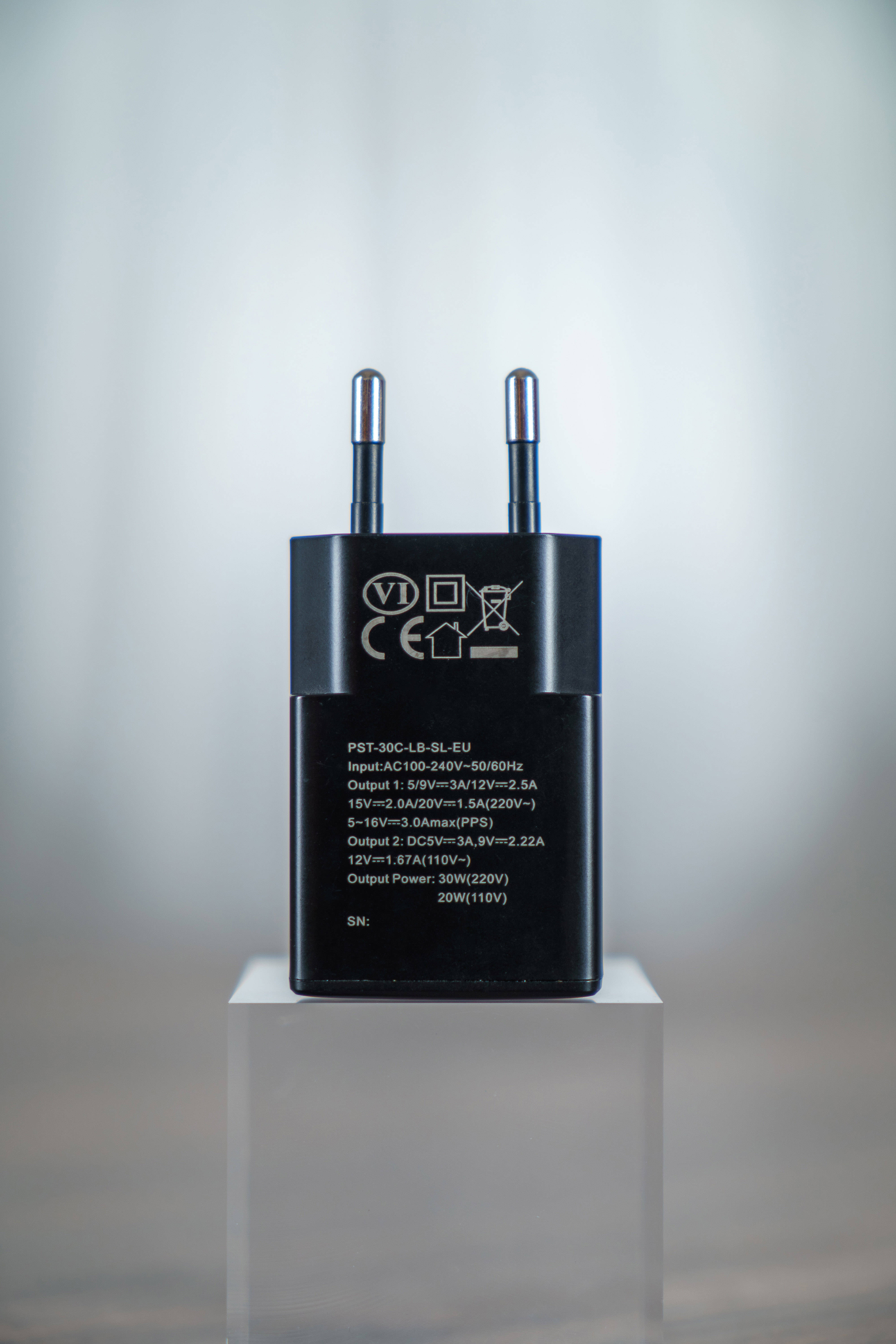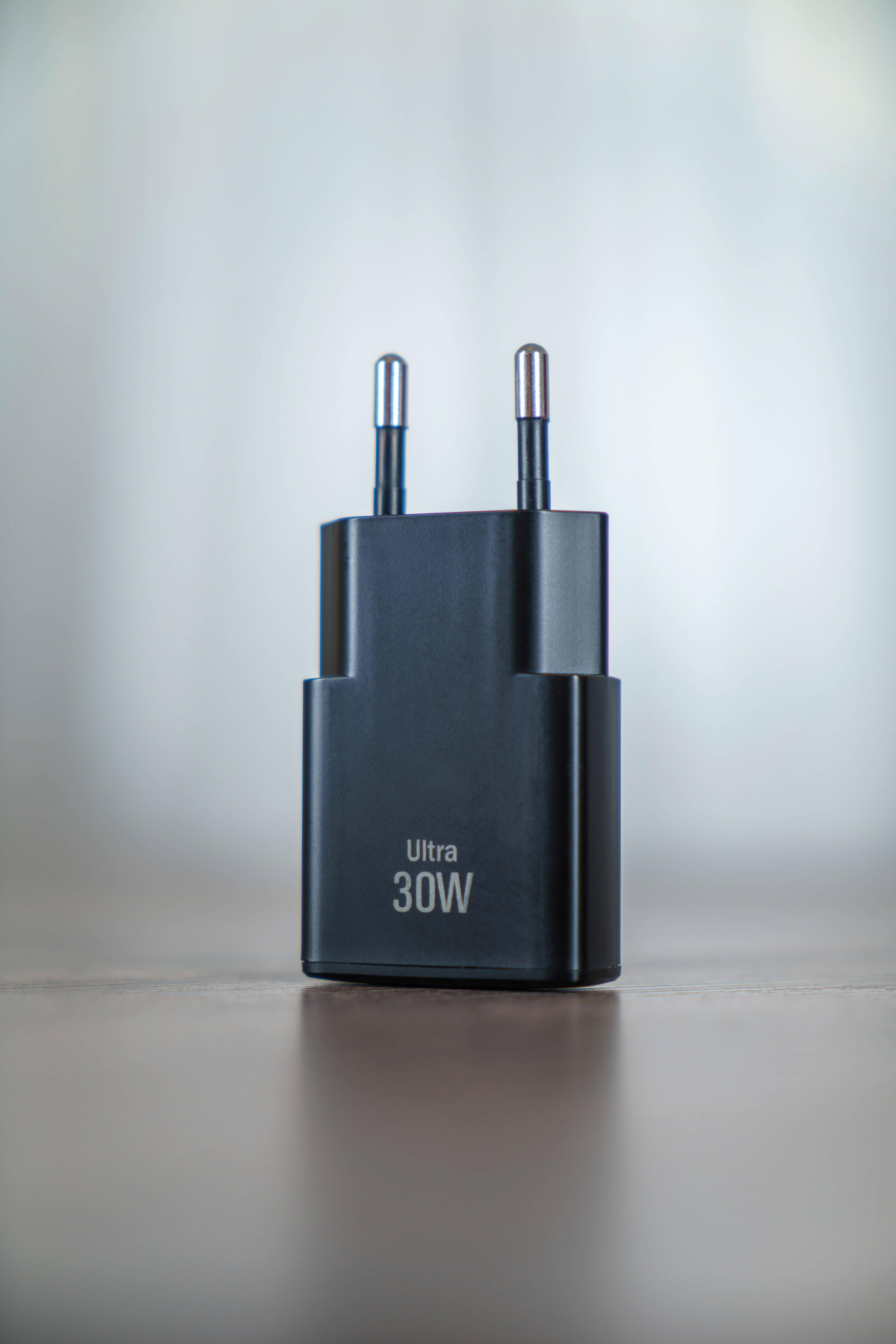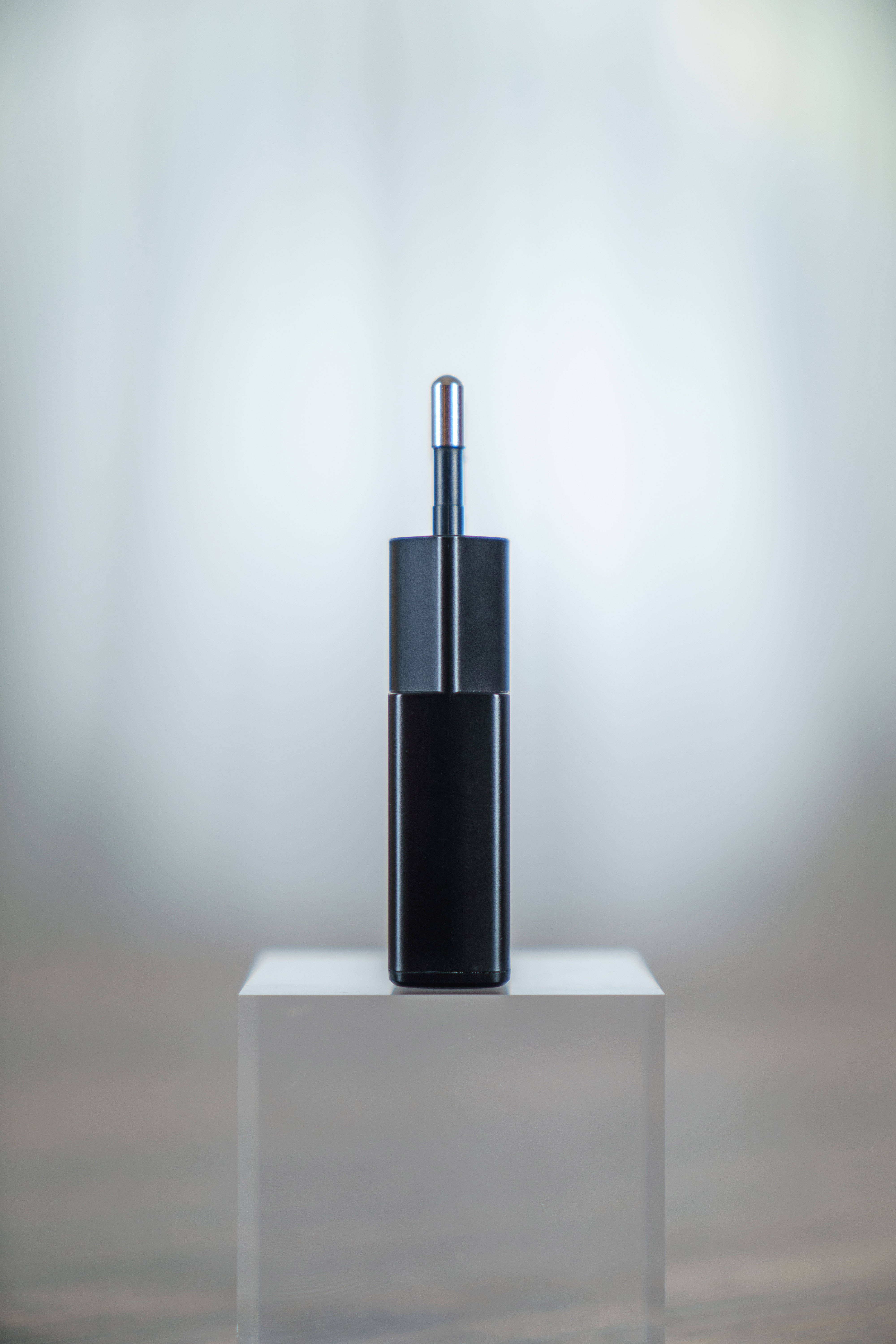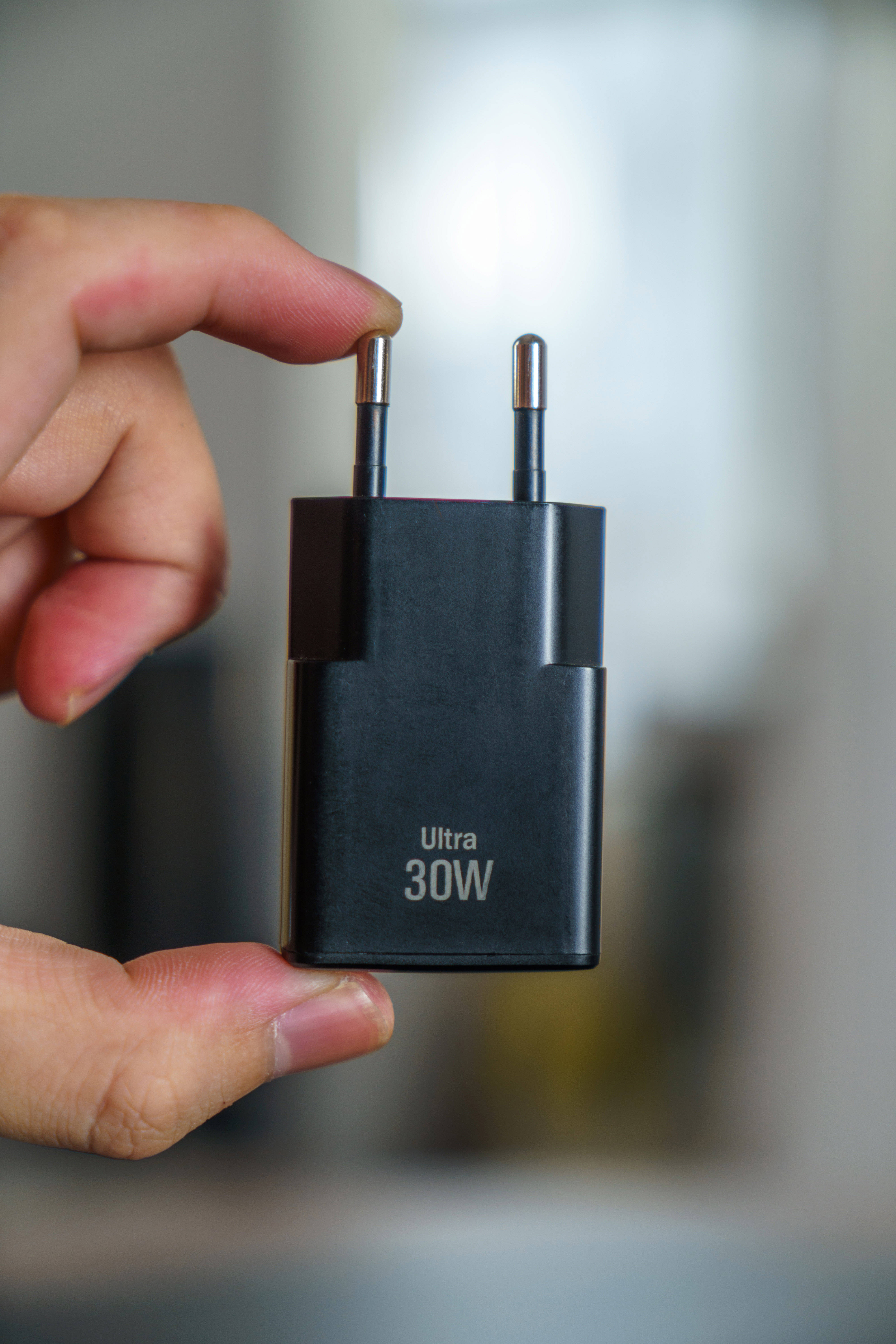 产品外观展示及介绍▼首先看一下产品的正面。通体黑色磨砂的表面处理,磨砂的好处就是耐指纹;最显眼的就是底下那30W和Ultra的文字标识,猜测它应该还有别的版本,比如Pro版这种;然后最上面就是欧规标志性的圆柱形插头了,乍一看它的造型大家可能并不会感觉有什么特别的,可能会觉得这不就是一个标准欧规风格的充电头嘛,不要急,等下换个角度看一下就知道了
