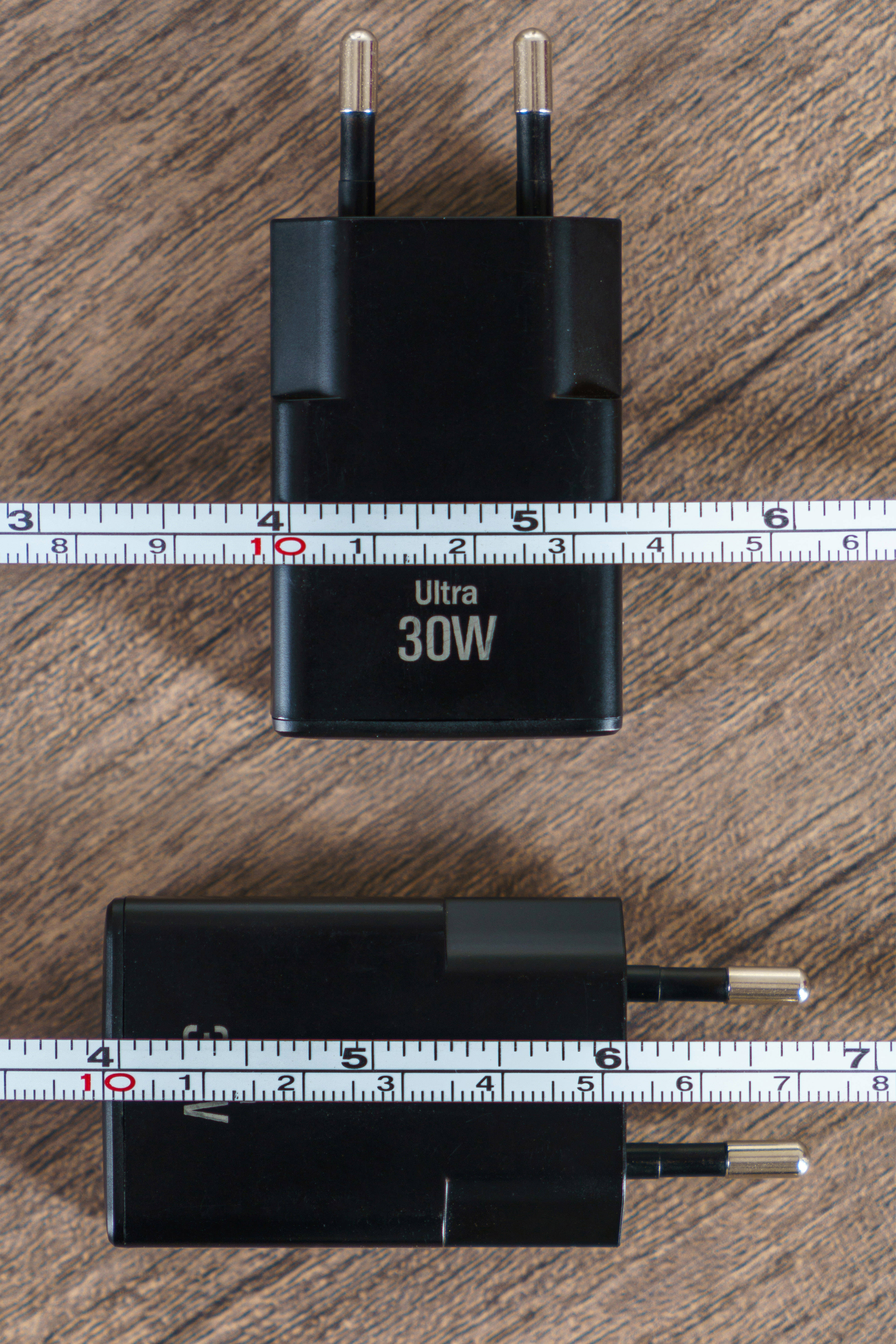 ▼来到侧面,是不是稍微震惊了一下?一开始你是不是以为它是一颗看起来非常笨重、厚厚的欧式造型,其实它非常薄,只有14mm厚,插头内置电路,一体成型,小巧玲珑,只比大部分手机机身厚那么一点点而已(部分成像模组突出的手机放桌上都比它高)要知道现在市面上30W氮化镓充电头的厚度,大部分都在30mm以上;也顺便量了一下长宽,主体尺寸大致为:35mm*52mm*14mm,算上插脚尺寸大致为:35mm*71mm*14mm
