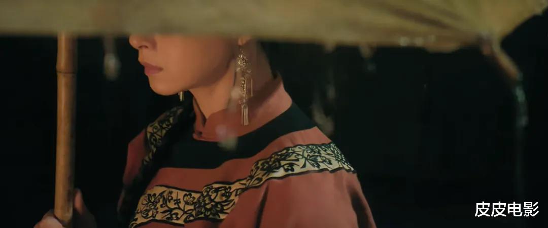 当雨夜里那把油纸伞缓缓抬起,一身豆红旗袍、耳垂流苏银饰的大阔枝袅袅娜娜走出,蒋欣用一个出场就让观众梦回《甄嬛传》。