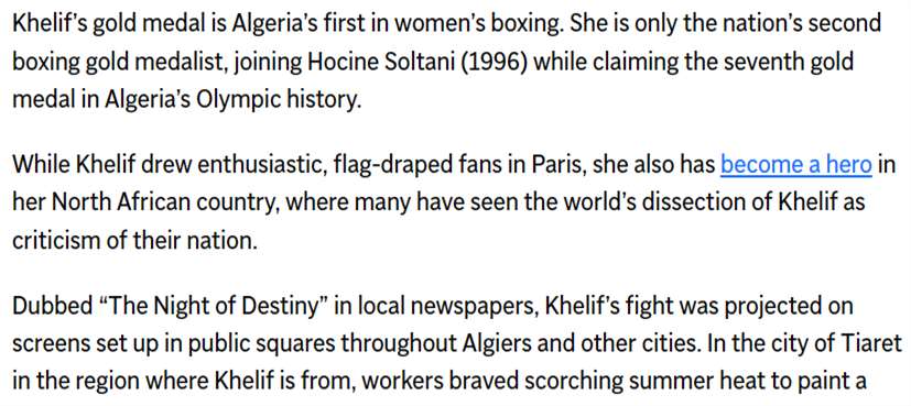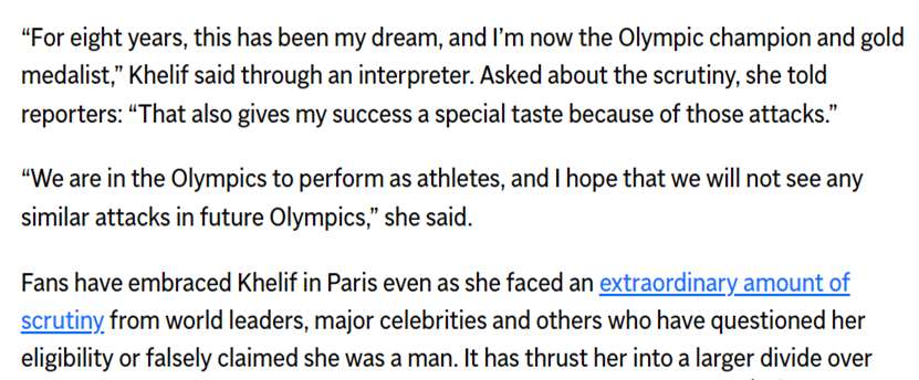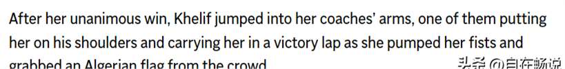 与此同时,哈利夫的胜利也在国际媒体上引发了广泛关注。美国APnews(美联社)等媒体纷纷报道了哈利夫的胜利和她所面临的性别争议。这些报道不仅让更多的人了解了哈利夫的故事,也引发了人们对于性别认同和体育规定的深入讨论。