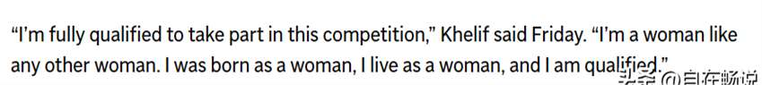 “我完全有资格参加这场比赛,”哈利夫坚定地说。“我是一个女人,就像任何其他女人一样。我生来就是个女人,我就活得像个女人,我是合格的。”她的声音铿锵有力,充满了自信和力量。