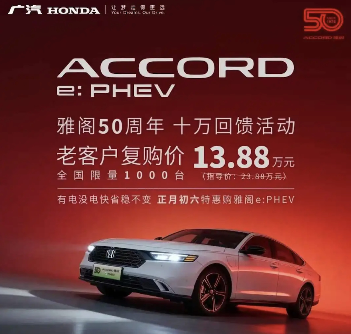 春节假期还没过完,广汽本田就在正月初六放出大招:推出“雅阁50周年 十万回馈活动”。雅阁e:PHEV老客户复购价仅需13.88万元,较官方指导价23.88万元直降10万元,全国限量1000辆。