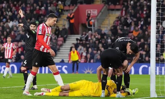 这位39岁的门将在与南安普顿后卫内森·伍德的肘部发生碰撞后倒地,痛苦不堪。