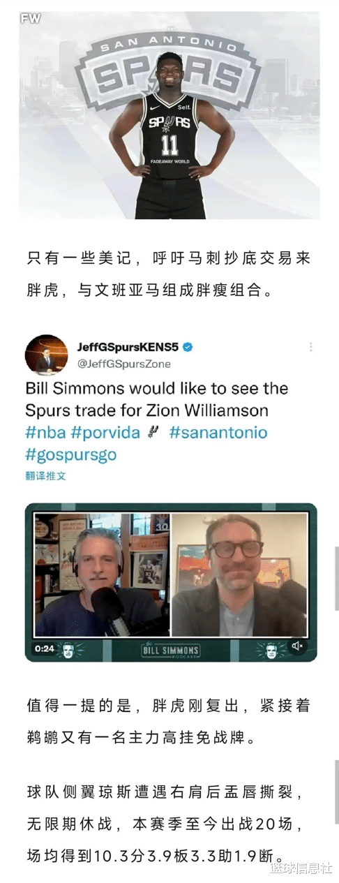 如今,权威记者Bill Simmons在播客节目中透露了自己的小想法,那就是希望马刺队在本赛季寻求和鹈鹕队谈判,用两枚首轮签和两位年轻人的筹码,从鹈鹕队交易得到当家球星锡安·威廉森。