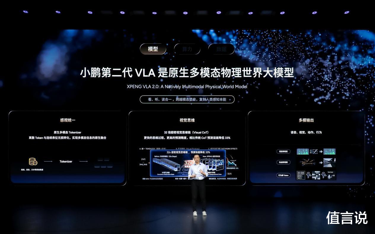 在模型层面,第二代VLA是原生多模态物理世界大模型,集“看、听、读”为一体,不仅适用于自动驾驶,还可应用于Robotaxi、飞行汽车和人形机器人等多个领域。在算力层面,小鹏汽车坚持软硬一体研发,通过芯片-编译器-模型的联合优化,大幅提升了算力利用率,降低了模型推理时延。在数据层面,第二代VLA累计使用了50PB训练数据,每秒处理约53亿字节视觉信息,每版模型的训练数据达到4万亿Tokens,为系统的持续优化提供了坚实的数据支撑。