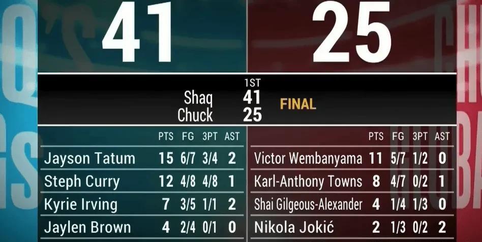 这比赛打得也是挺随意的,开场奥尼尔队就连得11分,巴克利队这边约基奇罚球都不中,亚历山大也就打进一个,看得出来状态都不在线,可能大家都没当回事。