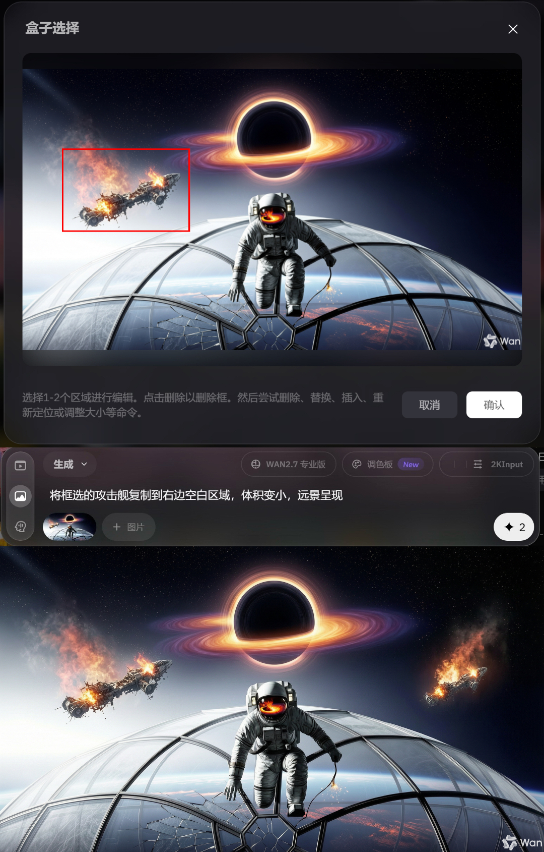 此外,Wan2.7-Image的交互式编辑的体验,比我预想的更实用。我自己实测时框选了已生成海报上的星舰,加上提示词就能精准复制到目标区域并进行微调。做影视分镜、海报时不用因为一个小细节就整张重绘,真正做到“哪里不爽点哪里”,彻底告别抽卡式返工。