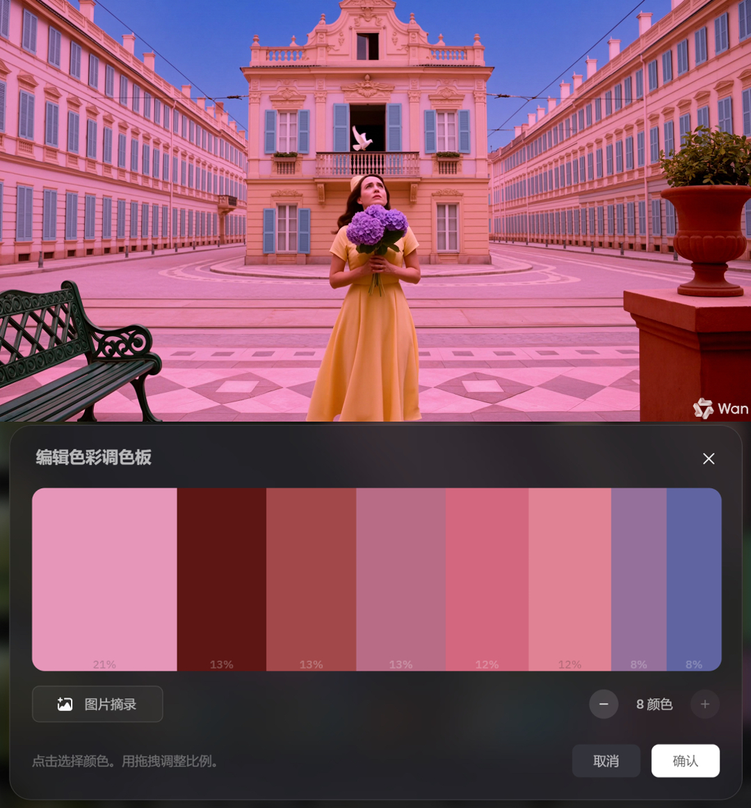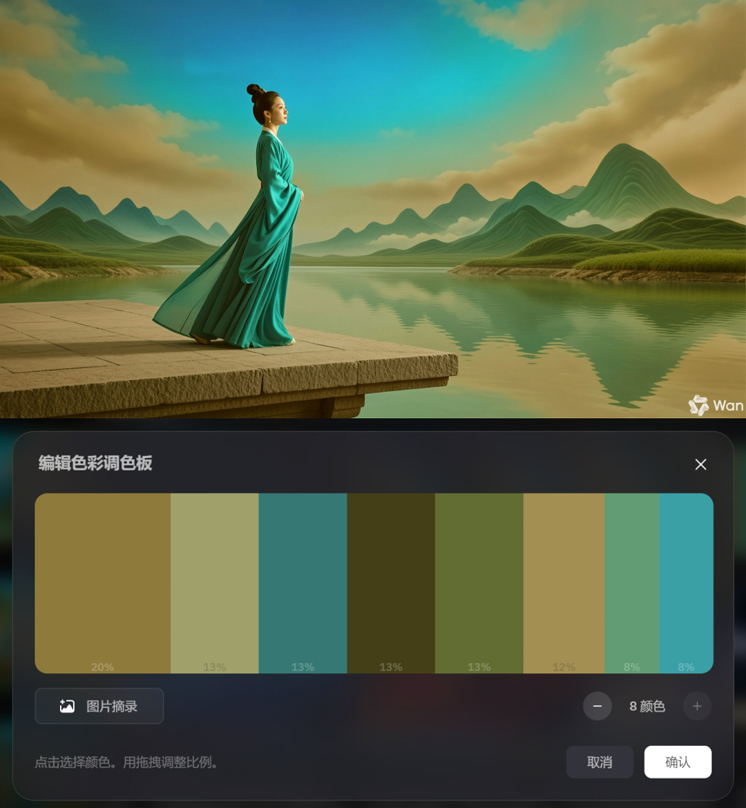再说说它主打的调色盘功能。以往AI出图时颜色全靠运气,想还原经典色调几乎不可能,但Wan2.7-Image支持HexCode自定义,不管是做影视宣发图还是IP视觉,设计师终于不用再跟“色彩盲盒”较劲了。这次我直接用它提取《千里江山图》的青绿配色,生成的古装剧照古韵十足,另一组取色《布达佩斯大饭店》的复古撞色,色调纯粹、比例控制精准。
