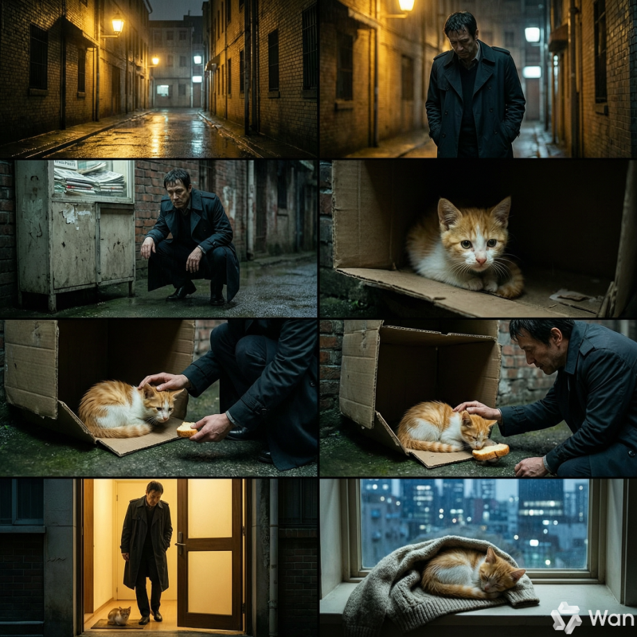 最后是多主体一致性,这个功能对群像创作非常友好。我实测了“人与猫”的多图生成,不管场景怎么切换,人物和猫咪形象都保持高度统一,互相救赎的情感逻辑也很连贯。模型最高支持9张参考图,做短剧群像分镜不会出现角色越来越崩的情况,稳定性在线。