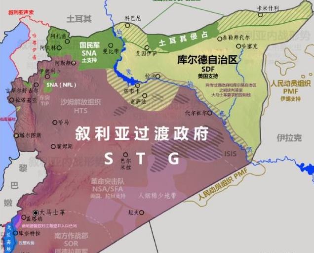 而随着以色列、美国等多方势力入局,叙利亚呈现出一个明显的分裂态势。虽然说大马士革有一个临时过渡的政府,但显然这个庙是装不下叙利亚各方势力的,不论是库尔德SDF,还是土耳其仆从自由军,还是HTS内部来说分歧都很大。目前HTS和南方作战部SOR、革命突击队NSA属于“叙利亚过渡政府”(STG),总部大马士革。而土耳其自由军SNA以及NFL,则单独成立“叙利亚临时政府”(SIF),总部在阿扎滋。算上残留的阿拉维派占领的沿海地区,还有IS以及库尔德,土耳其占领区,现在叙利亚其实是分裂的更严重了。
